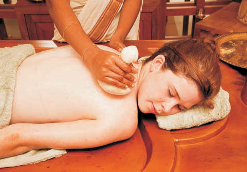 This is one of the most effective therapy of punchkarma for the treatment of injuries. Heated herbs and oils are tied in cloth bags and placed on the area to be treated, followed by specific massages, done using the fingers, heel of the hand of plam. the pressure applied varies according to the nature of ailment and the spot... a. It cures arthrits with swelling, back-pain and gives full relaxation.